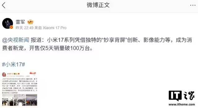 6 日音信10 月 ,昨日报道央视讯息,5 天销量破 100 万台幼米 17系列手机开售仅 ,行了转发确认雷军自己进。