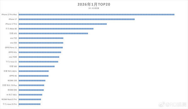 新闻】3月5日【CNMO科技,年1月国内手机单品销量TOP20榜单博主“RD观测”统计并揭橥了2026。显示数据,三款机型强势经办榜单前三位苹果iPhone 17系列,月最大赢家成为开年首。