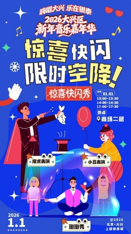 2月31日跨年音笑扮演龙湖北京大兴天街:1,接待新篇正在交响中,倒计时玩法等你来互动更有跨年气球雨+跨年,人的专属歌颂吧疾来接待代言。6年1月3日孩子王开业12月31日至202,会+疾疾超爱笑喜悦帮阵飞鹤途演+炫卡斗士谋面。18日“就地有喜市”开市克日起至2026年1月,宋锦、花果茶韵、有机草莓包罗万象14+手作摊位:珍珠手作、非遗,不拆档英华!