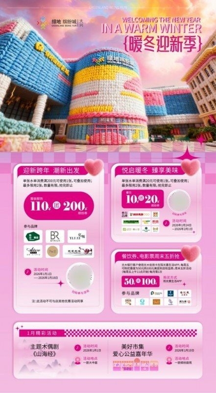 城:1月1日大兴绿地缤纷,山海经于1F大中庭上演元旦大戏核心IP木偶剧,新年神线日共赴一场,迎春祥马,券上新(树生计、BR、adaro等品牌可用潮新开赴:装束衣饰-110团200元缤纷,00元可利用1张单张水单消费满2亚星会员注册加利用可叠,用2张最多限,限购2张每名会员)